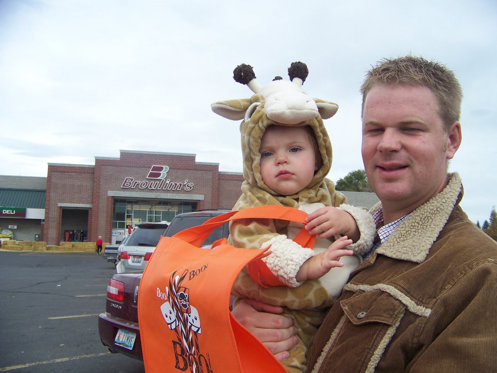 Okay, I know I already posted pictures of Payton in her giraffe costume, but she looked so stinkin cute so what's a few more, right? We went trick-or-treating at Broulims, but Payton didn't bring in a good haul for us. They probably knew it would be Gregg and I eating all the candy... =( I also threw in a picture of Payton sitting in the yard... I thought giraffes were supposed to be tall and skinny???
